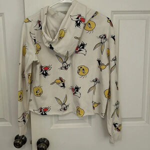 This is a Warner Bros. Looney Tunes cream sweatshirt. Has Sylvester Bugs Bunny and Tweety bird. Size medium. 60% cotton 40% polyester. Has hoodie.