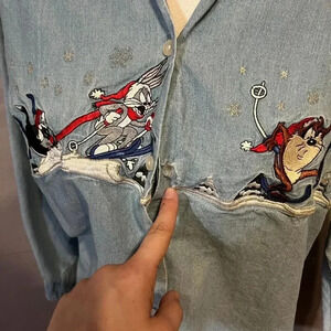 Warner Brother Studios Womens FLAW Denim Looney Toons Christmas Shirt SZ XS Y2K