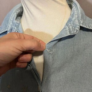 Flaws: Missing a button. Has a big hole in front. Could be worn if patched up or mended.