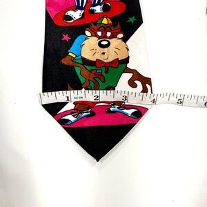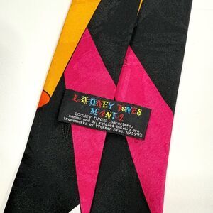 Vibrant vintage 1993 tie featuring Warner Bros. cartoon characters. Black base with colorful accents. Adds fun to any outfit. Great teacher gift!
