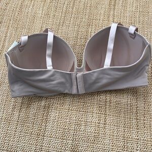 This bra has a cushioned underwire for no digging or poking! It has removable straps and has the elastic in the side bands that help it stay in place while going strapless. It’s very soft! Non smoker home
