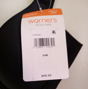 Warner black bra women's size 34 B. Lightly padded side, back, and underarm smoothing with adjustable straps. NWT.