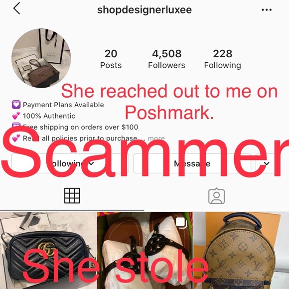 The women that runs this Instagram page stole $900 from me for a bag I never received. She claim she “mailed it” but she sent me a fake mailing receipt with no packages going to my address or even the state where I live. Be careful guys and gals. She reached out to me after I liked several LV listings on poshmark.