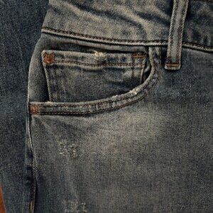 Mid/high-rise straight leg jeans. CDG is crafted with a touch of stretch for light sculpting around the thighs and midsection. Jeans are distressed and hems are asymmetrical - be sure to look at photos.