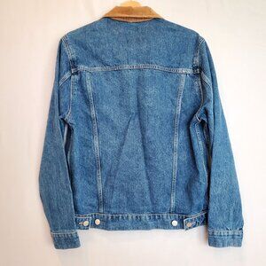 This men's trucker jacket has a corduroy collar and is in great pre-owned condition. Minimal wear, laundered and ready to ship. Measurements included in description and photos.