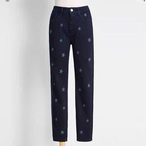 Modcloth Warp + Weft MPX Ringer Milan High Rise Skinny Jeans Star Patterned Dark Blue Denim 28 NWT. While a traditional pair of jeans uses 1,500 gallons of water to produce, a pair of Warps uses less than 10 gallons! Warp + Weft recycles and treats 98% of the water they do use. ModCloth-exclusive, star printed skinnies. Crafted trom premium, sustainably made, stretch denim designed to hold you in and retain shape, high-rise jeans feature dark blue wash and star print. Zip fly button closure, classic five pocket styling, and skim the ankle. Sculpted, slim fit through hip that holds you in and skinnier fit through legs. New With Tags. For photo reference and fit. I am a waist 29, 5’5, and can zip these up but they would fit a size 28 better. They have stretch so are comfy!