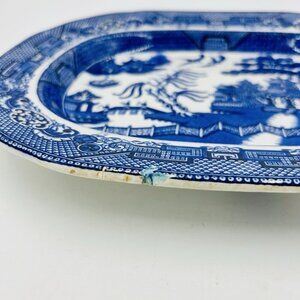 Warranted Staffordshire W. Adams & Sons England Blue Willow Platter 11.25" x 9". This platter is in good condition. There is one small chip on the underside rim, see pics.