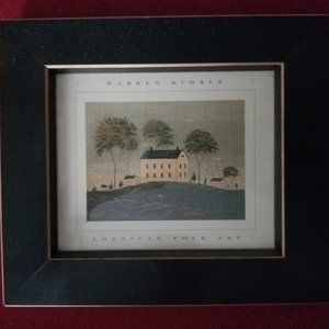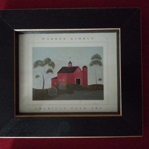 Pair small folk art prints, black wood frames, each measures 8"W x 7"H, depicting red barn with silo and white country house on a hill; lovely addition to an Americana decor, pre-owned, excellent condition, $40 for the pair.