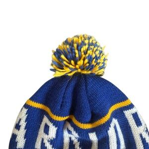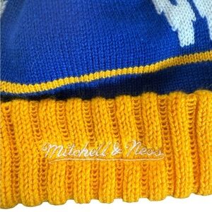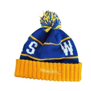 Mitchell & Ness Golden State Warriors Hardwood Classics knit beanie with Pom Pom on top. Royal blue & gold. Warriors Basketball emblem on one side & Mitchell & Ness embroidered on other side. 100% Acrylic SFPF HOME