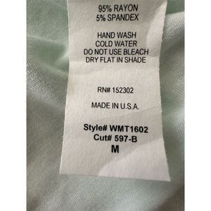 Keywords: Wasabi + Mint, women's t-shirt, green tee, V-neck, twist knot, casual wear, short sleeve, all seasons, rayon, spandex, comfortable fit, USA made.