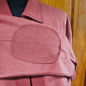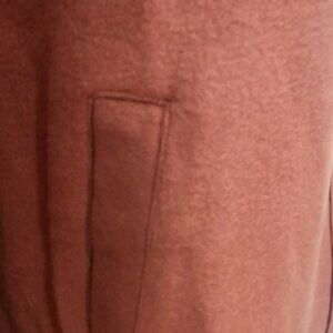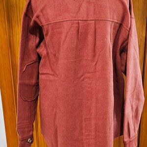Regular sized shirt jacket, long sleeve, fleece fabric. Garment washed and elbow patch. Front buttons and pockets. Rust color.
