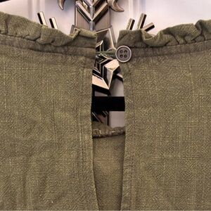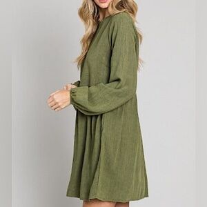 Comfy washed gauze long sleeve dress in Olive green, features an a-line silhouette, ruffled at neck, round neckline, elastic sleeves.