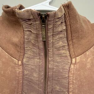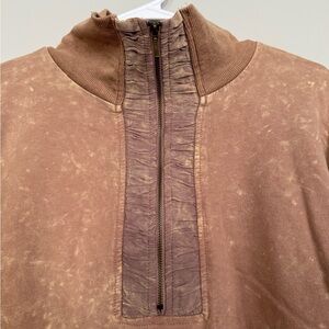 Soft washed pullover with a quarter-zip front. Comfortable relaxed fit. Ribbed collar and cuffs. Subtle mineral wash texture.