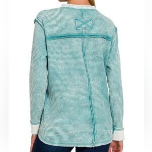 Nice teal waffle fabric, button henley. Cotton woven contrast, cotton waffle knit body. Narrow sleeve opening. Color is teal in first photo, other photo shows details only.
