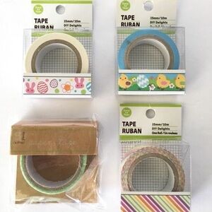 Listing is for 4 rolls of washi tape with Easter Eggs & Rabbits, Stripes, Chicks and Green Plaid, new in package. Each Easter Washi roll measures 15mm x 10m and the green plaid roll measures .59 inches x 5 yards.