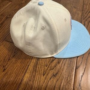 Stylish cream baseball cap with a light blue brim. Features a Nationals logo. New Era. Cream/baby blue. Size 7 1/4.