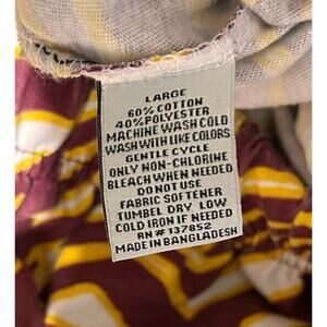 The product is a pair of men's Washington Commanders Zubaz pants in size Large, featuring burgundy and gold NFL football stripes. These athletic pants are a perfect accessory for any fan of the Washington Commanders, showcasing their team colors and logo. Made for football enthusiasts, these pants are a comfortable and stylish way to show support for your favorite team during game days or casual outings. Perfect for any football-loving man looking to represent the Washington Commanders in style.