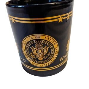 Washington DC mug cup. Navy blue with gold capitol building and seal of U. S. Government. A handsome souvenir piece.
