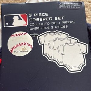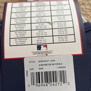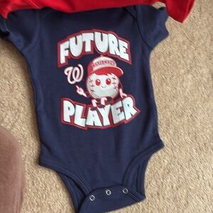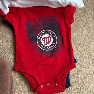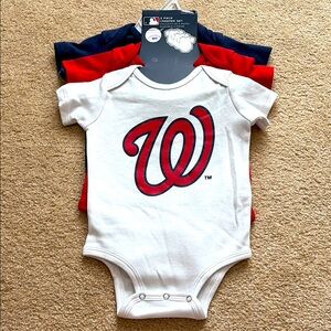 Set of baby bodysuits featuring the Washington Nationals logo. Includes white, red, and navy colors.