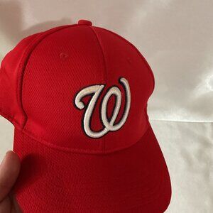This red Washington Nationals baseball cap features an embroidered "W" logo on the front and an MLB logo on the side. Constructed with breathable polyester mesh, it ensures comfort and durability. The adjustable strap provides a customizable fit for various head sizes.