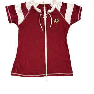 Washington Redskins short sleeved t-shirt that’s burgundy with two white stripes on each arm. It laces up the front with a shoe string tie. The Indian head logo is on the left chest. It has been gently preloved.