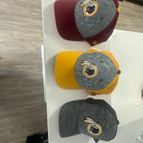 Set of three Washington Football Team caps. Includes maroon, yellow, and gray colors. Perfect for fans.