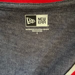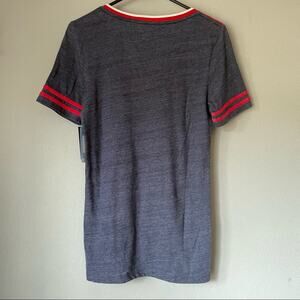 V-Neck, Looser flattering fit, heather blue with contrast color shoulders and sleeve trip. Short Sleeve, foil red team logo design.