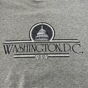 Heather gray pullover crewneck sweatshirt with chest print of ‘Washington DC’ and the Capitol roof.