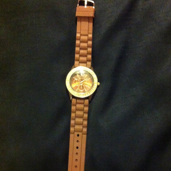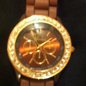 Very pretty chocolate colored band with a rose gold and and crystal bezel and chocolate face. Has a good operating battery