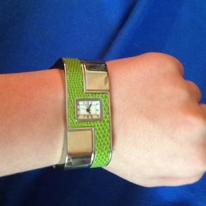 Sliver watch with green snakeskin texture accent. Overall shape of watch is square, but it is still super comfy. I have it listed as not for sale, but I don't wear it that often, so if you're interested, make me an offer!