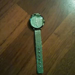 Cute silver watch with cute silver raised Eiffel tower detail.