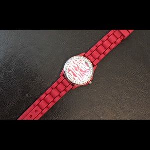 Red watch with rubber band and red and white zebra striped face. Never been worn