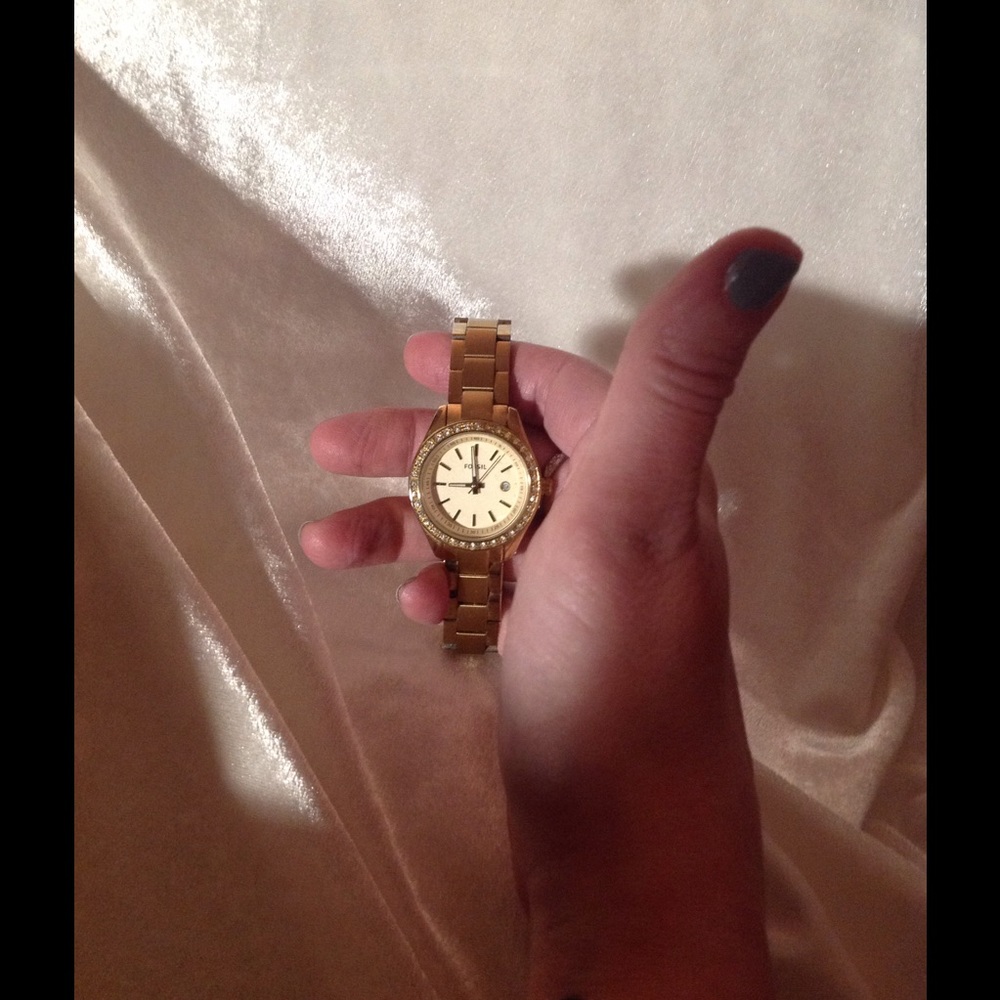 Beautiful gold Fossil watch. Ladies. Small diamonds around the face. Worn some, not really much, date night type of accessory for me. I do have a classic vintage style box in my jewelry bundle or add-s. If you'd like it just let me know before purchasing the watch and I'll give you a great price on the box too.