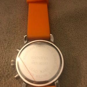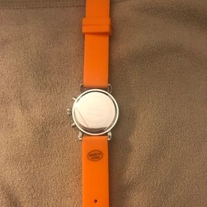 This cute watch has an orange band and gemstones around the face. No scratches it just needs new batteries