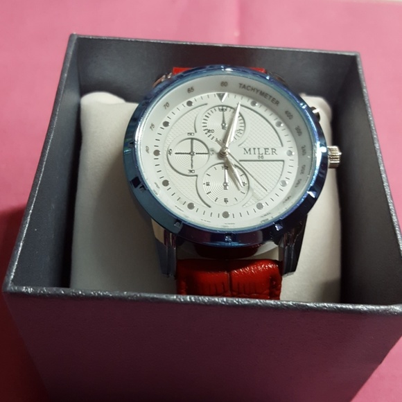 Watch with red leather strapped & silver & blue face.