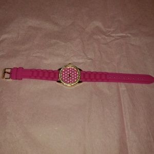 Quartz Movt watch. New with out tag or box. Silicone strap round face with clear stones on the outer part of the face and small white hearts on the inside of the face. Stainless steel back.