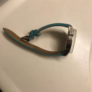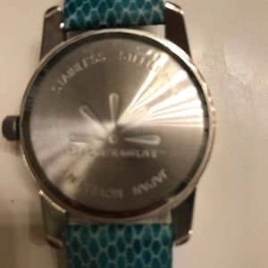 Isaac Mizrahi Live watch. Stainless steel and Turquoise genuine leather band. 8 crystals on face of watch. Works great, just needs a battery.