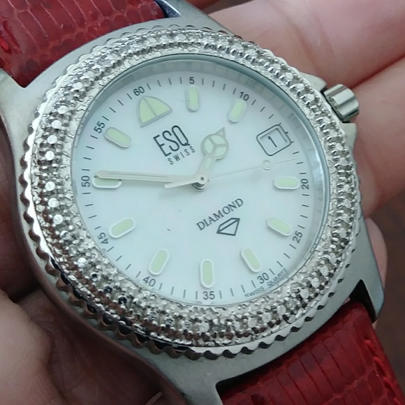 Ladies ESQ stainless steel watch... Diamond bezel.. MOP dial with date. Red genuine leather starp. Preloved worn condition. Scratches and signs of wear present. This is a great staple peice. Change strap to black/brown and give it a classic look. So so pretty... I just dont wear anymore.