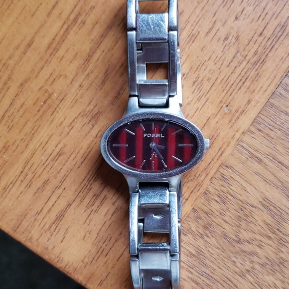 Silver watch with pretty red face on it. Wear and tear scratches but not bad!