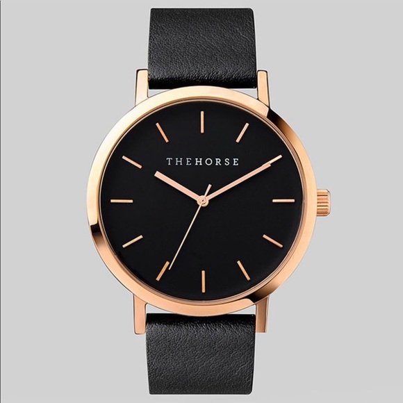 Polished rose gold stainless steel case, black dial with minimalist rose gold markers, and a black genuine leather band. The Horse logo lettering on dial and at buckle closure.