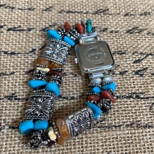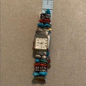 Stretch bracelet watch. Turquoise, coral/tan stones with silver face.