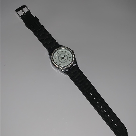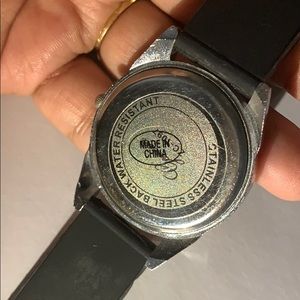 Black watch. Looks matte but is shinny in the sun. Good condition. Water resistant. Stainless steel.