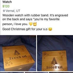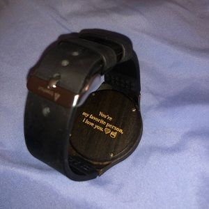 Wooden watch, with a rubber wrist band. Is engraved on the back and says “you’re my favorite person, I love you. 💛🍯”
