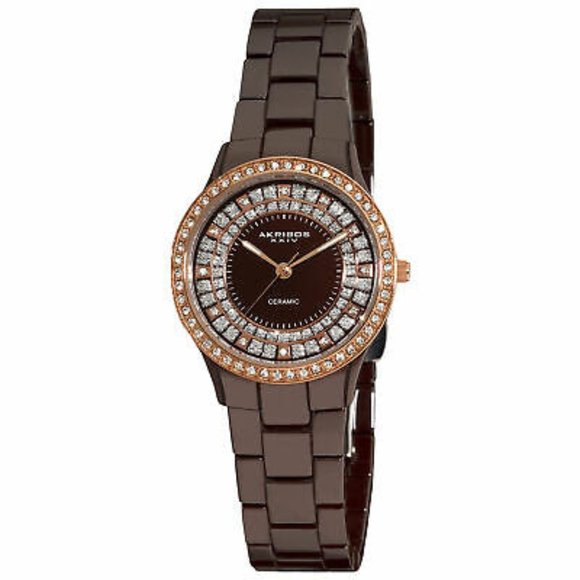 AkribosIXV ladies ceramic watch emblazoned with crystals. Water resistant 30 meters, mineral face. Rich dark chocolate color. Used a few times, has a very light single scratch on mineral face.