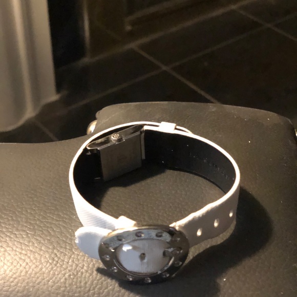Baume Mercier white grosgrain bracelet with diamond accent clasp. Watch is hidden