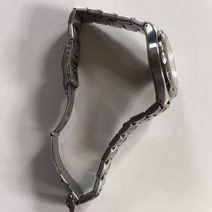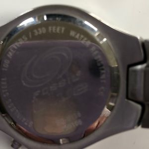 Fossil blue, new battery,glow in the dark, glass has 2-3 small scratches, water resistant, stainless steel, 100 meters/330 feet, (day of the week seems not in working order)