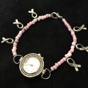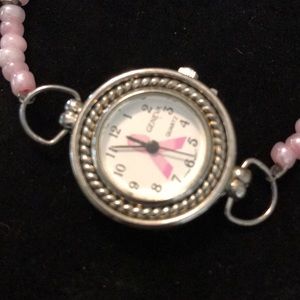 Pink cancer watch made by hand. Length is 8 and 3 quarters in. Sterling silver.