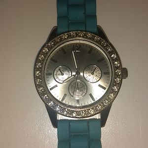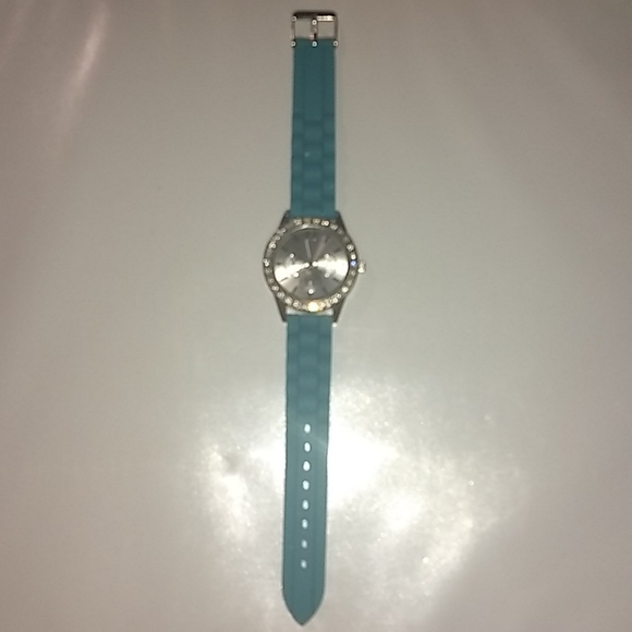 Blue silicone band with rhinestones all the way around it silver face