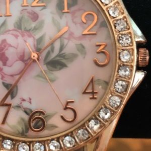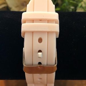 Light pink soft rubber band with gold trim and diamond like rhinestones. New battery