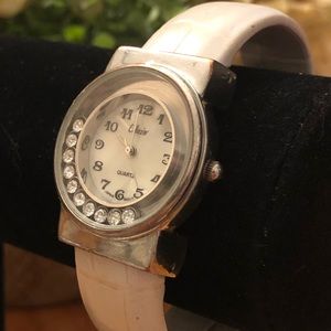 White leather band with silver face and small crystals that move around. New battery